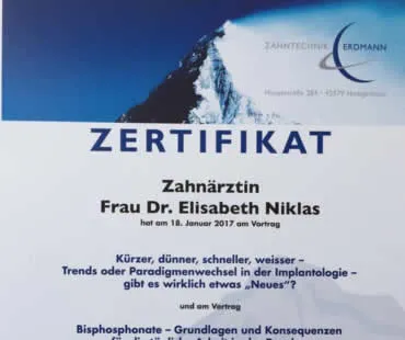 Am 18.1.17 nahm Frau Dr. Niklas am Vortrag zu den Themen Trends oder Paradigmenwechsel in der Implantologie und Bisphosphate - Grundlagen und Konsequenzen teil.